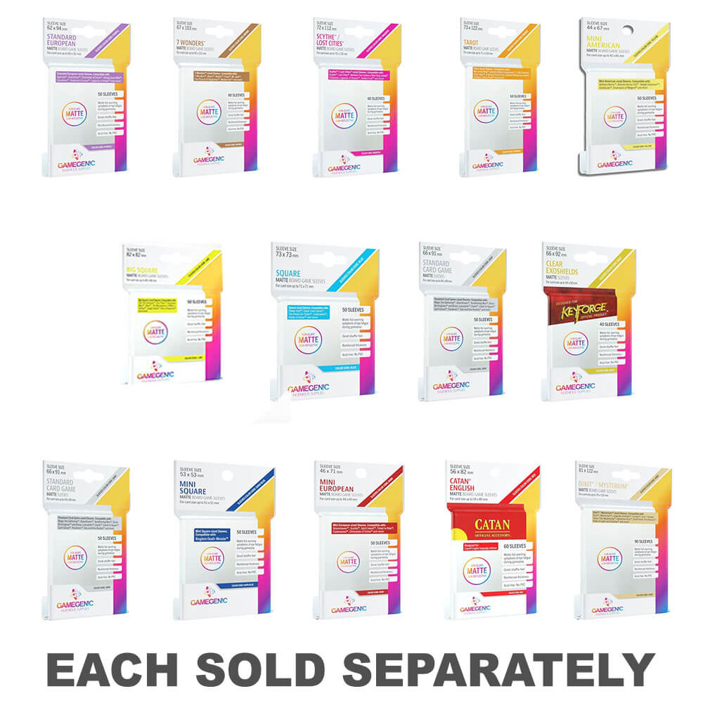 Die bekannten und etablierten Sleeve Color Codes von Fantasy Flight Games™ werden in dieser Produktlinie fortgeführt. Spieler werden das bewährte Farbsystem wiedererkennen und neue Größen mit neuen Farbcodes finden.
