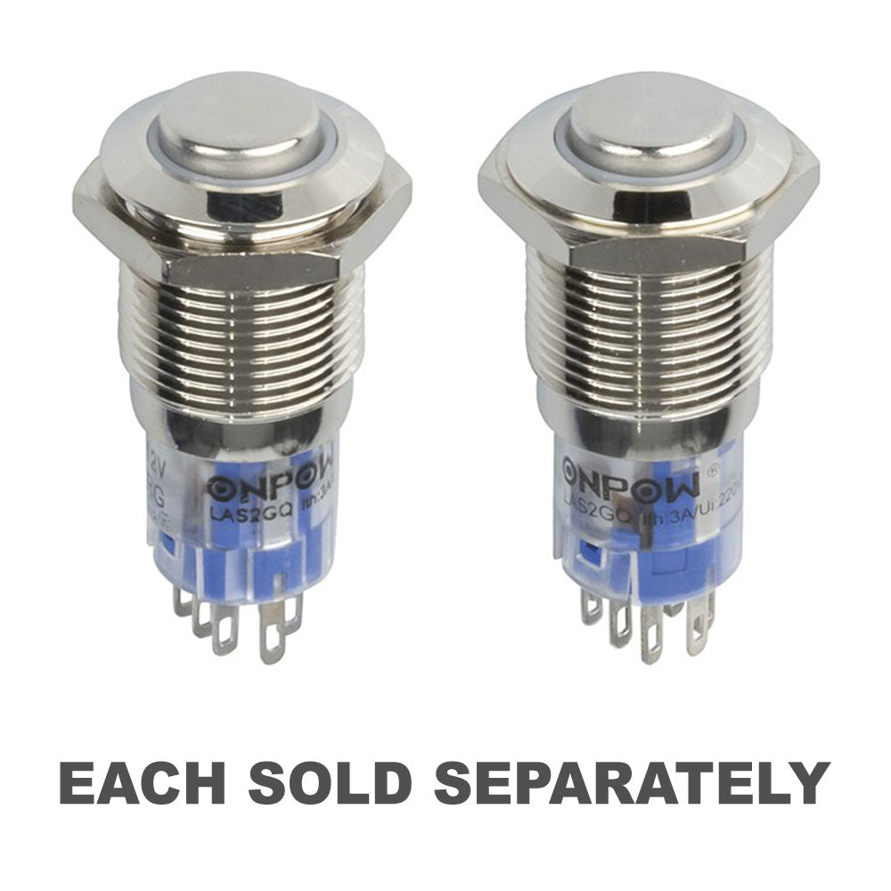 Schalter mit Schutzart IP67 für den industriellen Einsatz oder andere raue Umgebungen. Zweifarbig rot/grün beleuchtet, Metallgehäuse, DPDT, Momentanschaltung.