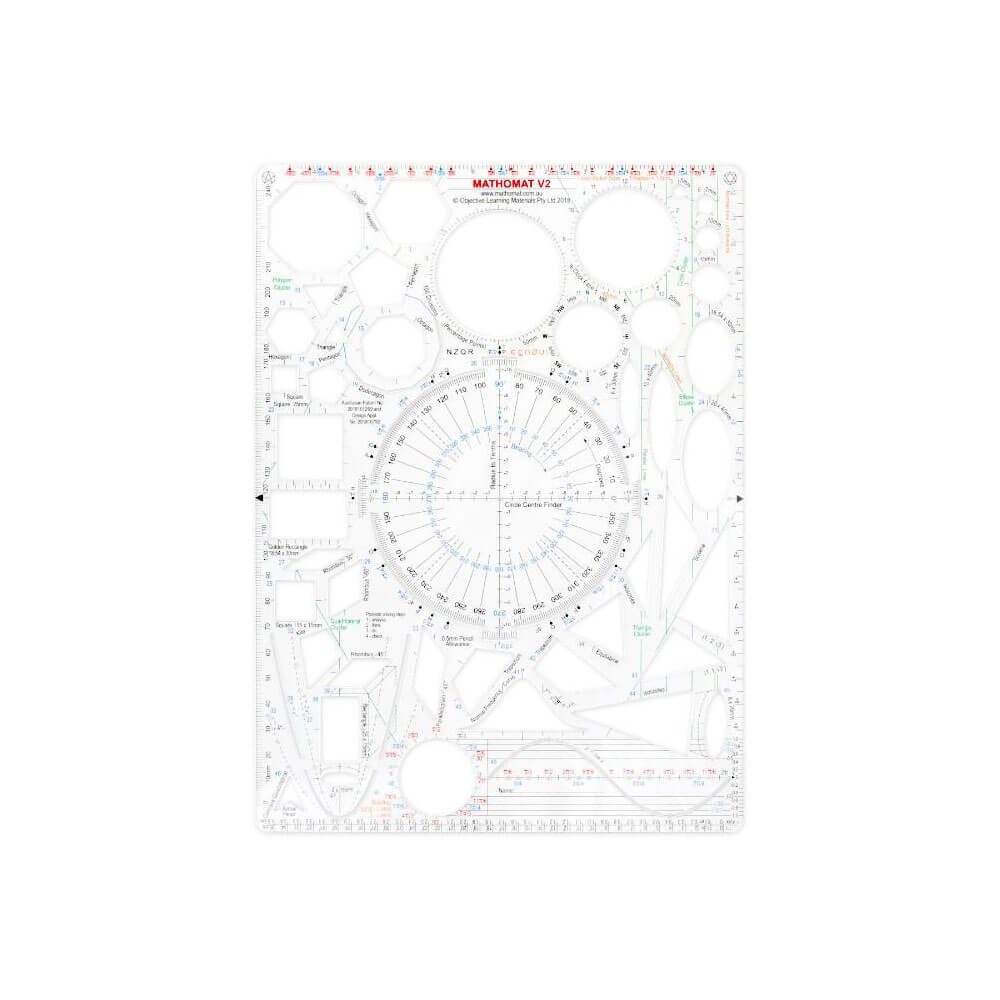 Mathomat-Vorlagen vereinen viele Werkzeuge in einem einzigen Instrument; Lineal, Winkelmesser, Zirkel ersetzen Kreise, viele Zahlenlinien und geometrische Formenschablonen, Ellipsenvorlagen, Diagrammführungen und trigonometrische Funktionsmaschine.