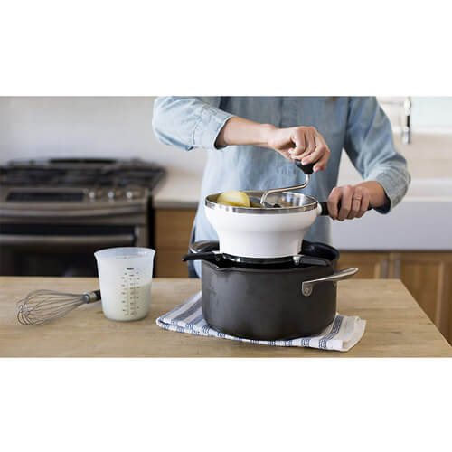 - Eine bequeme Lebensmittelmühle zum Herstellen von Saucen, Pürees und Suppen.