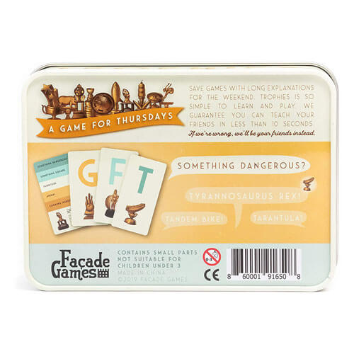 • Ein Spiel für Donnerstags: Sparen Sie Spiele mit langen Erklärungen für das Wochenende. Spielen Sie stattdessen Trophäen, ein Spiel, das so einfach und lustig ist, dass es nur Sekunden dauert, um zu lernen, wie man spielt.