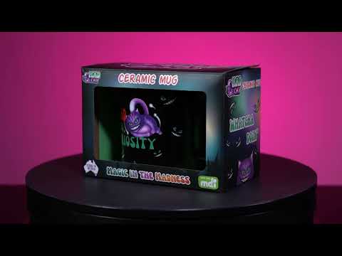 - Keramikbecher mit einer frechen verrückten Katze, umgeben von grinsenden Gesichtern