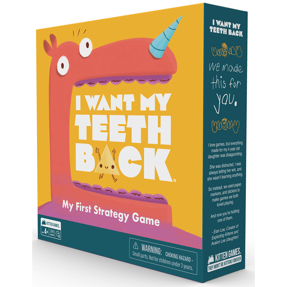 - Jeg vil have mine tænder tilbage spilindhold: Deltag i Tooth-Rrific Adventure med 1 Spinner, 1 Landing Mat, 4 Meefs, 57 kort, 1 menukort og 60 tænder. Dette spændende kortopsamlingsspil er fyldt med alt hvad du har brug for til uendelig sjov-fyldt gameplay. Spin spinneren, navigere landingsmåtten og gå i gang med en spændende søgen efter at finde Meefs mistede tænder! Med en bred vifte af komponenter tilbyder dette spil timer med underholdning og spænding for spillere i alle aldre