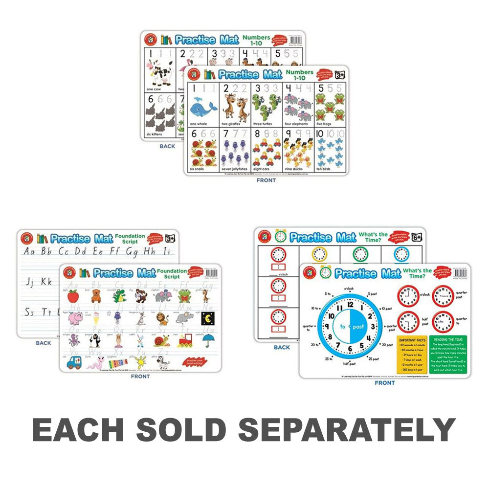 Børn vil elske at øve deres færdigheder i læsefærdigheder og talekund med disse engagerende og farverige praksismåtter. Det er vigtigt, at dette er det eneste produkt på markedet, der er skræddersyet til Australien -læseplanen. Unik for dette produkt; Matten kan bruges med en tør sletningspen, så den kan tørres ren til brug igen og igen. Opmuntret, børn vil snart mestre både håndskrivning og talfærdigheder på praksismåtterne gennem gentaget leg.