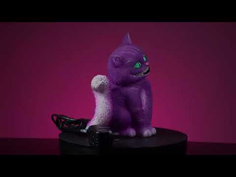 LED bordlampe af en grinende gal kat med livlige turkis øjne. Gør et unikt ornament om dagen og lyser rummet om natten. Lav spænding førte sikkert for børn.
