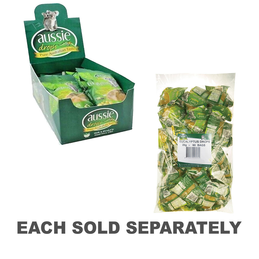 Experience the soothing and refreshing qualities of Aussie Drops Eucalyptus Drops in a convenient and portable format. Each pack contains 60 bags, with each bag containing 25g of these classic drops infused with eucalyptus goodness. With this supply, you can enjoy the invigorating taste of eucalyptus whenever you need it, whether for throat relief or a revitalizing treat.
