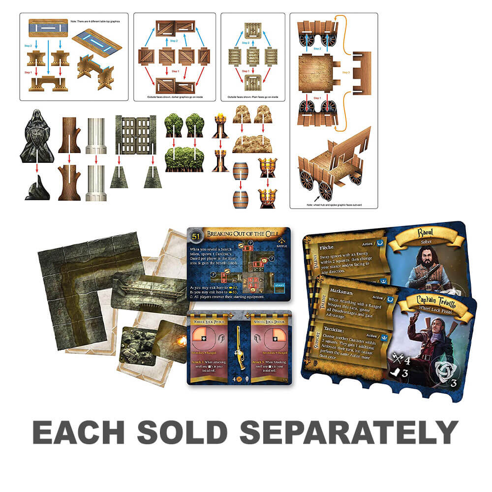 Includes slot-together cardboard objects for all terrain tiles used in Gascony's Legacy, plus the expansions: The Man in the Iron Mask & The Count of Monte Cristo.