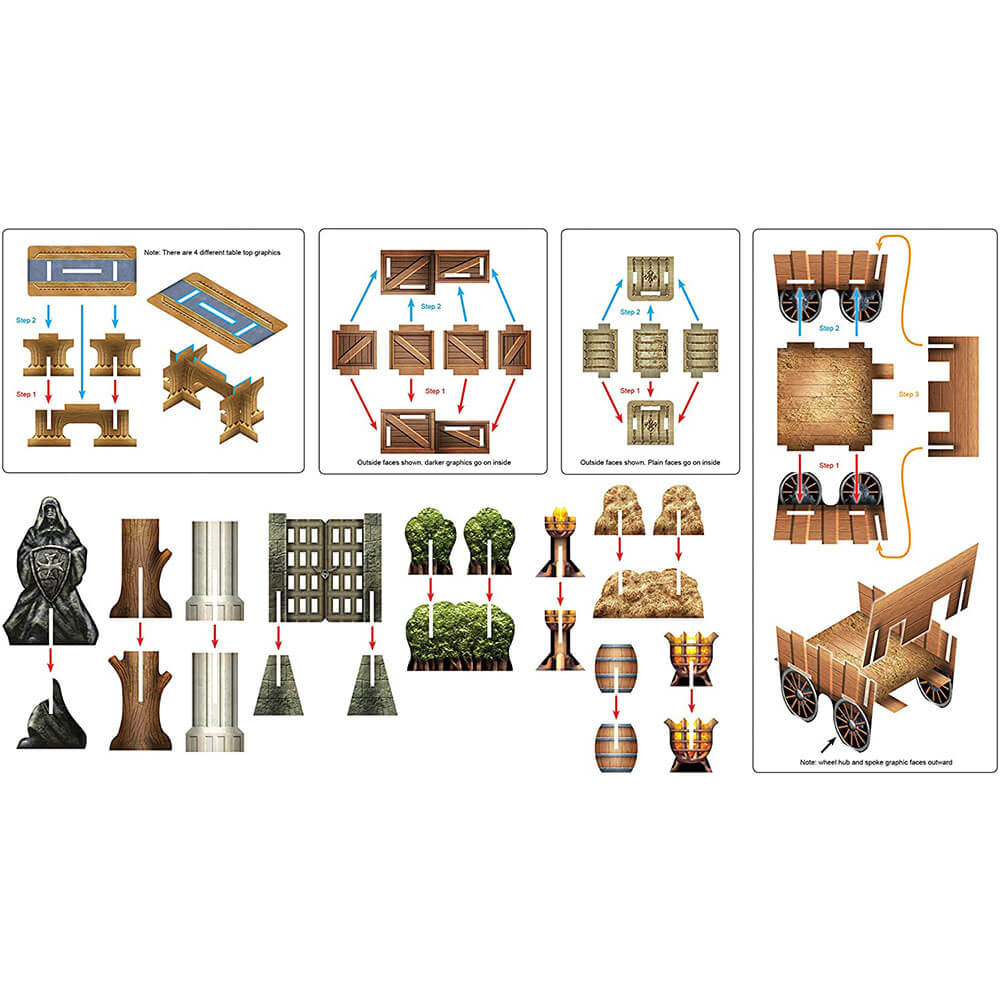 - The pack will contain approximately 4-5 punch boards filled with quick assembled obstacles which include (but not limited to): Barrels, Potted Plants, Chests, Furniture (Chairs and Tables), Pillars, Rocks and Shrubs, Doors, Flames of Hope, and Despair Urns.