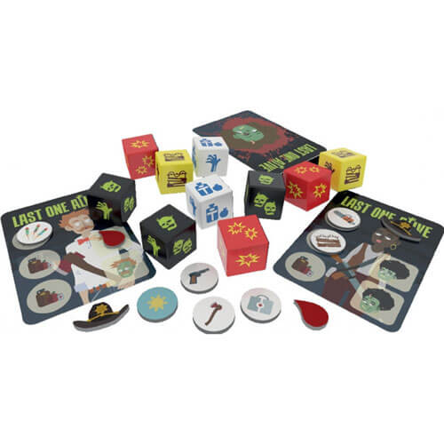 Last One Alive is a fast and fun dice game for 2 to 5 players. The game is played in turns: each player rolls a selection of dice to eliminate the attacking zombies, or send them toward other players. If, at the end of a player's turn, any zombies are left, the player is overpowered and eliminated from the game. There are four different types of custom dice to choose from. Zombie dice will âspawnâ zombies to kill or drive away; Shot dice will make you shoot zombies; Item dice will allow you to find precious items to survive; Barricade dice will let you build up your defense. Last One Alive is fast paced: the rhythm of the game increases turn by turn, as the number of zombies in play grows and they become more and more deadly for the players using the "Zombie Apocalypse" rules.