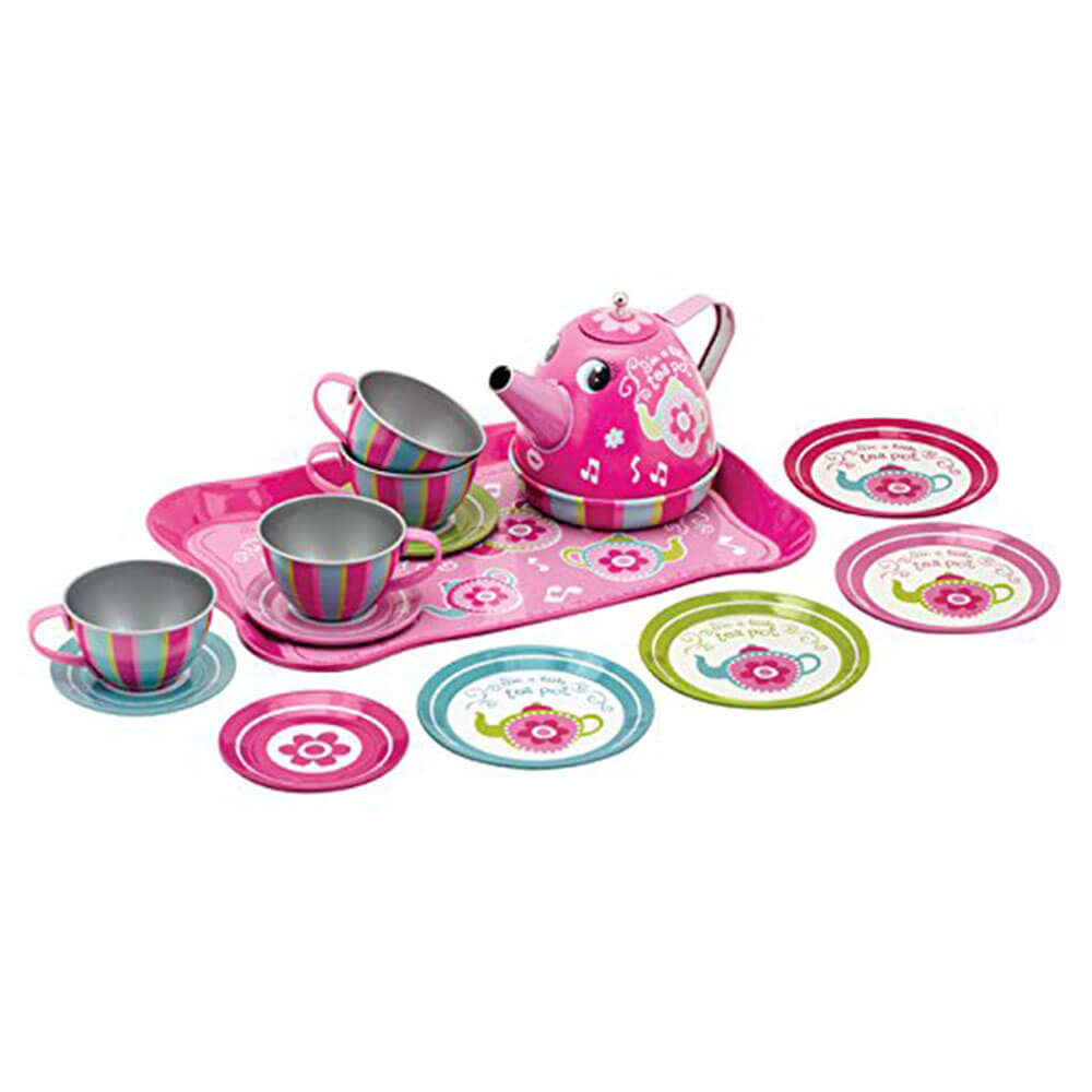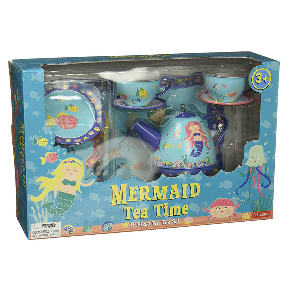 Have tea under the sea with mermaids and fish friends! this 15 piece tin tea set includes service for 4 & serving tray.