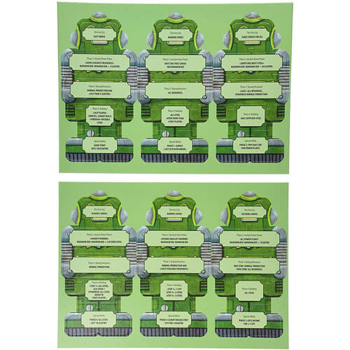 - Der Roboter besteht aus fünf Spielsteinen, einem Spielstein mit Regeln für jede Phase sowie einer Spezialfähigkeit, die der Roboter während des Spiels nutzt.