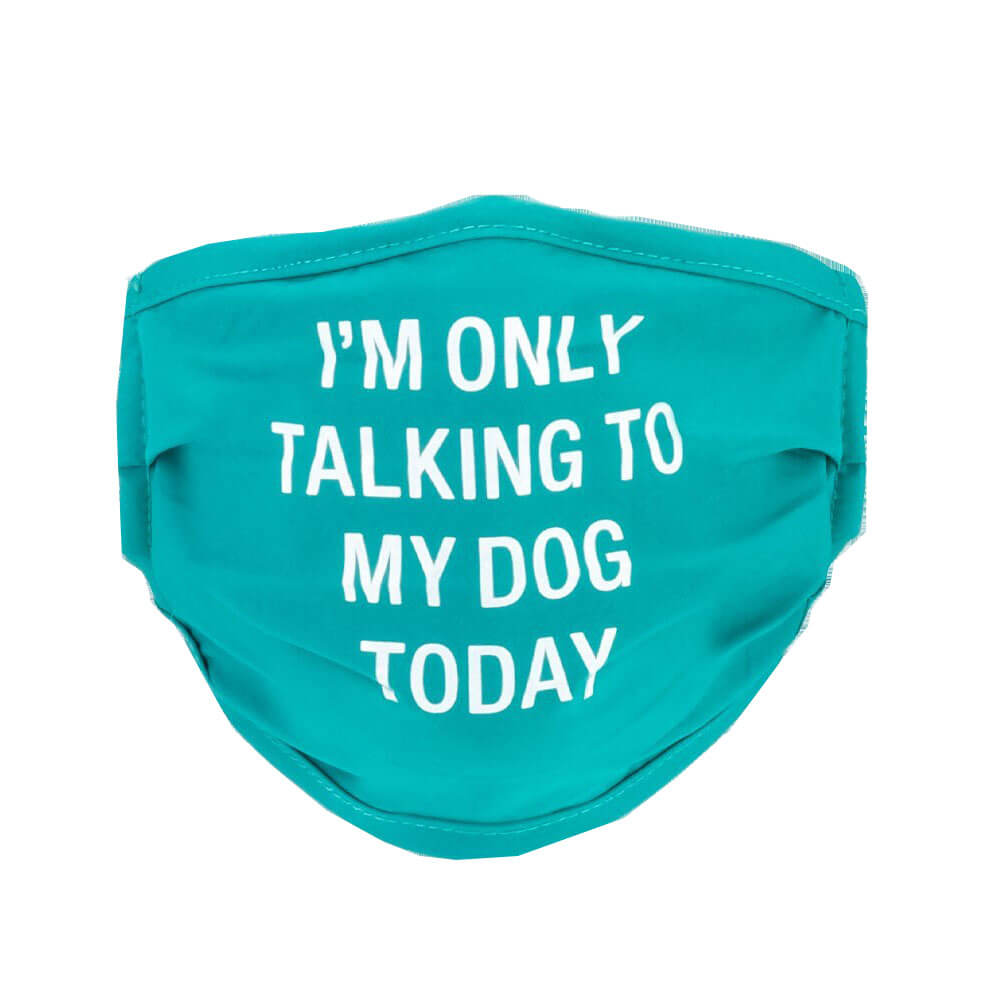- Auf der Maske steht: „Ich rede heute nur mit meinem Hund.“