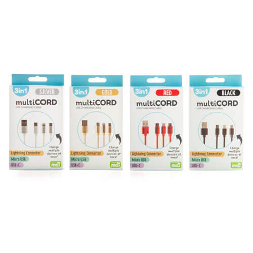 Cordon de charge multifonctionnel avec 3 types de connecteurs différents.