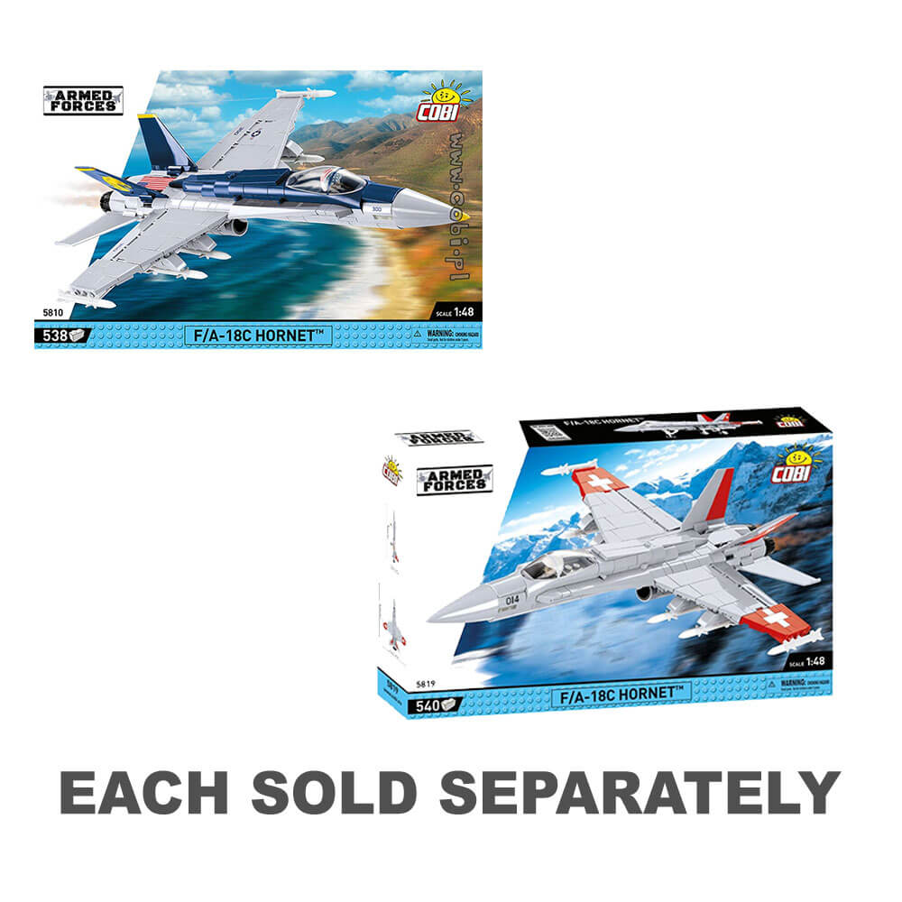 Le F / A-18C Hornet est un modèle de chasse multi-role unique dans les couleurs de la Suisse. L'avion a été préparé dans un modèle d'échelle 1:48, en utilisant 540 blocs de construction Cobi. L'ensemble comprend des impressions de haute qualité imitant la peinture de l'avion d'origine. Le modèle est équipé d'un chariot pliant et de roues rotatives. Sous les ailes se trouve un grand arsenal d'armes. Vous pouvez placer un chiffre pilote spécial dans la cabine. L'ensemble comprend également un support de bloc et une plaque avec le nom de l'avion. Cet ensemble exclusif et sous licence s'adresse à tout le monde, quel que soit l'âge, y compris les fans de l'aviation et des militaires. L'avion a l'air tout aussi attrayant dans un bureau ou dans la chambre d'un adolescent.
