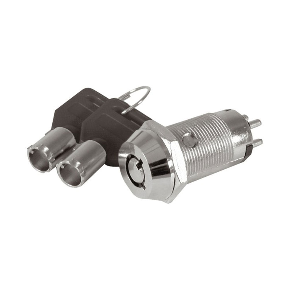 このキースイッチは、黒いプラスチックインサートを備えた管状キーを使用して、簡単に識別します。 2つの位置があり、キーは両方から取り外し可能です。 4つの接続端子がありますが、それは通常のダブルポールシングルスロー(DPST)スイッチではなく、むしろ他の連絡先のペアが他の状態とは反対の状態にあるため、デュアルシングルポールシングルスロー(SPST)チェンジオーバースイッチです。 。