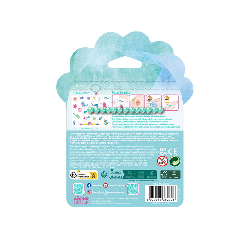 Dive into a world of colour and creativity with the Avenir Bracelet & Tattoos - a playful set featuring 22 vibrant temporary tattoos and a soft, stylish bracelet with a pink shell accent. With designs inspired by thee sea, including shells, dolphins and other ocean treasures, this set is perfect for imaginative play and self-expression. Beautifully packaged and easy to use, the tattoos apply with water and are gentle on young skin, making them ideal for parties, dress-up, or everyday fun. Whether its a beach themed adventure or a splash of colour for a special occasion, this set is sure to delight. Ages 3+ Pack Dimensions (cm): H: 17 W: 3 L:11