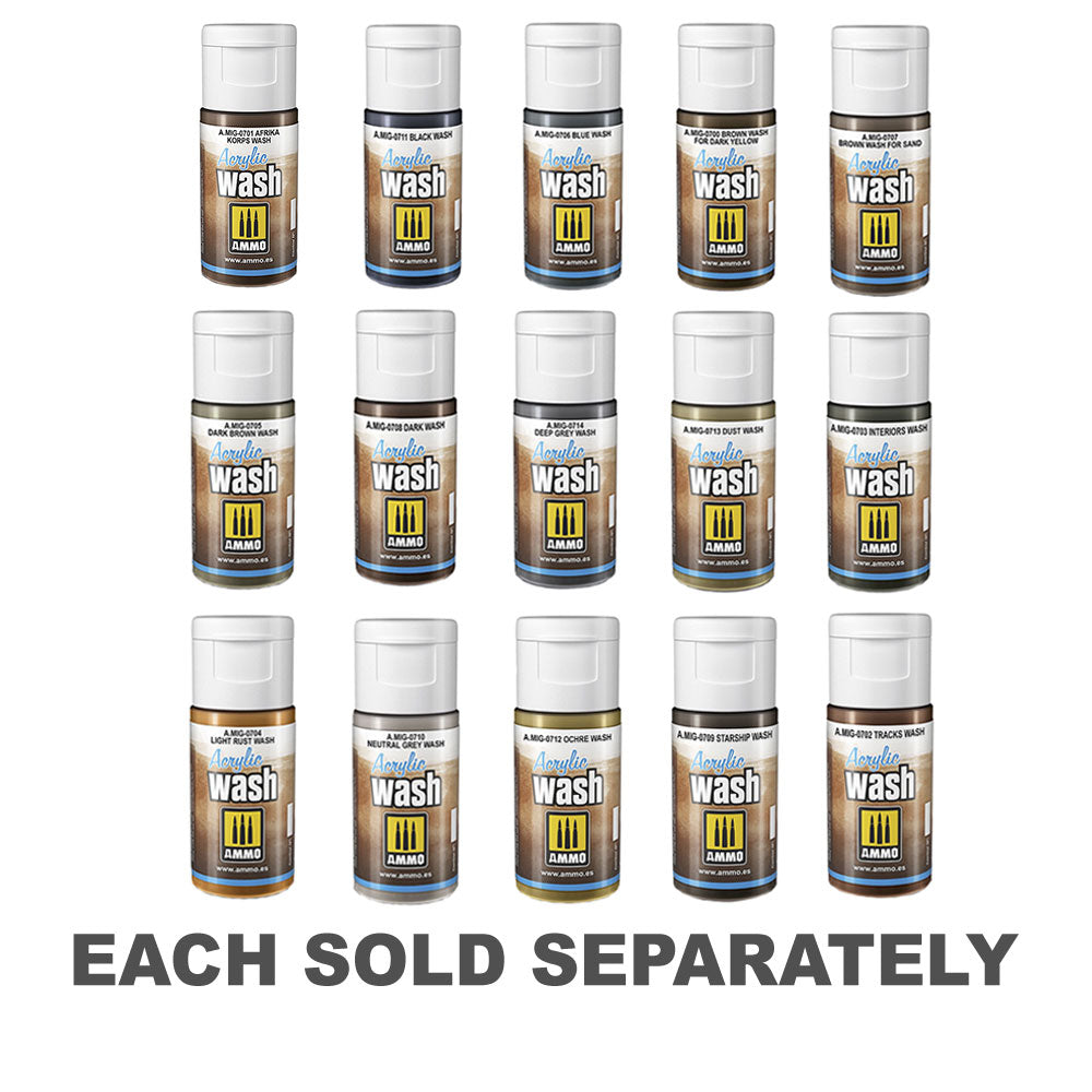 洗浄は、すべてのタイプとテーマの被験者とジオラマに関するすべてのモデラーが使用する最も古く、最も重要なモデリング手法の1つです。エナメル質タイプとアクリルタイプの両方を含む2つの異なる製剤で開発されました。各タイプは、モデルのさまざまなニーズと各モデラー需要の好みに適応するための異なる品質を備えています。どちらも優れた結果を提供し、非常に簡単に適用できます。アクリル洗浄の利点は、毒性や臭気がないため、自宅や家族の近くでそれを使用することは問題ではなく、エナメル洗浄よりも速く乾燥するため、大切な時間の短い時間でプロセスを完了することができます。 。アクリルウォッシュは、投与キャップ付きのボトルに入っており、後で使用するためにパレットまたはコンテナに数滴を置くことができます。ボトルの容量は15 mlですが、ディスペンサーを使用すると、製品を保存し、より精度を持って作業できます
