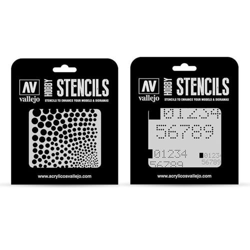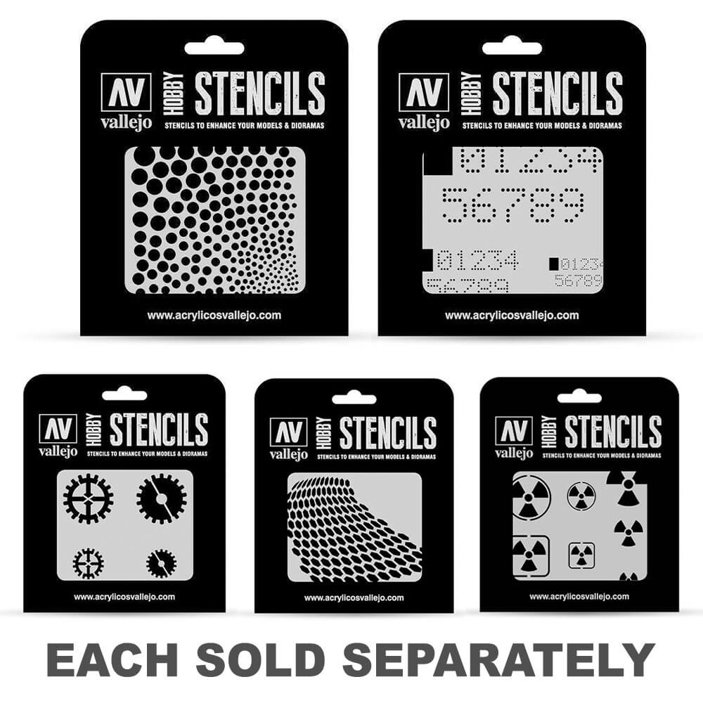 Vallejo Stencilsは、モデラーとクラフター向けの参照とテーマの幅広い選択を提供しています。いくつかのカテゴリがあります:AFVマーキング:バッジ、数字、スローガン、標識、ユニット、国籍マーキングは、歴史的および現代的な装甲車両向けに設計されています。カモフラージュ:装甲車と航空機のカモフラージュのパターン。いくつかのスケールで利用可能。エアマーキング:バッジ、数字、ユニット、国籍マーキング、レジストリ、歴史的および近代的な航空機向けに設計された表面効果。レタリングと標識:ジオラマ、広告、小売標識、落書きの交通標識、フォント、標識。 SCI-FI&FANTASY:バッジ、数字、エフェクト、パネル、SF車両や宇宙船向けに設計されたパターン。テクスチャ効果:スプラッシュ、テクスチャ、ひび割れ、汚れ、その他の物理的なテクスチャーと効果。