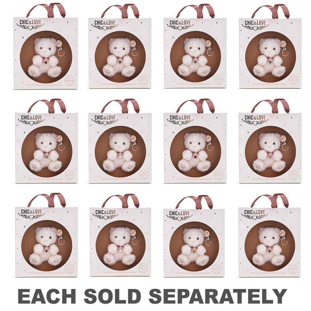 Bailey Bear Bag Charm en Swarovski Birthstone ketting. Bailey Bear heeft zachte premium pluche stof, aangevuld met een roségouden satijnen lint. De tasclip heeft een roségouden kreeft sluiting met een Swarovski -kristallen medaillon. De ketting is gemaakt van messing en is rose goud verguld met een swarovski granaat januari geboortesteen. Gepresenteerd in een geschenkdoos met een roségouden satijnen handvat en matte afdichtingafwerking. Beschikt over folie gestempeld en spotglans details.