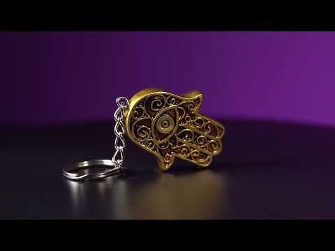 Mystieke handgeschilderde Hamsa-handsleutelhanger. Beschikt over ingewikkeld Hamsa -ontwerp met een metalen afwerking op een traditionele sleutelhangerring.