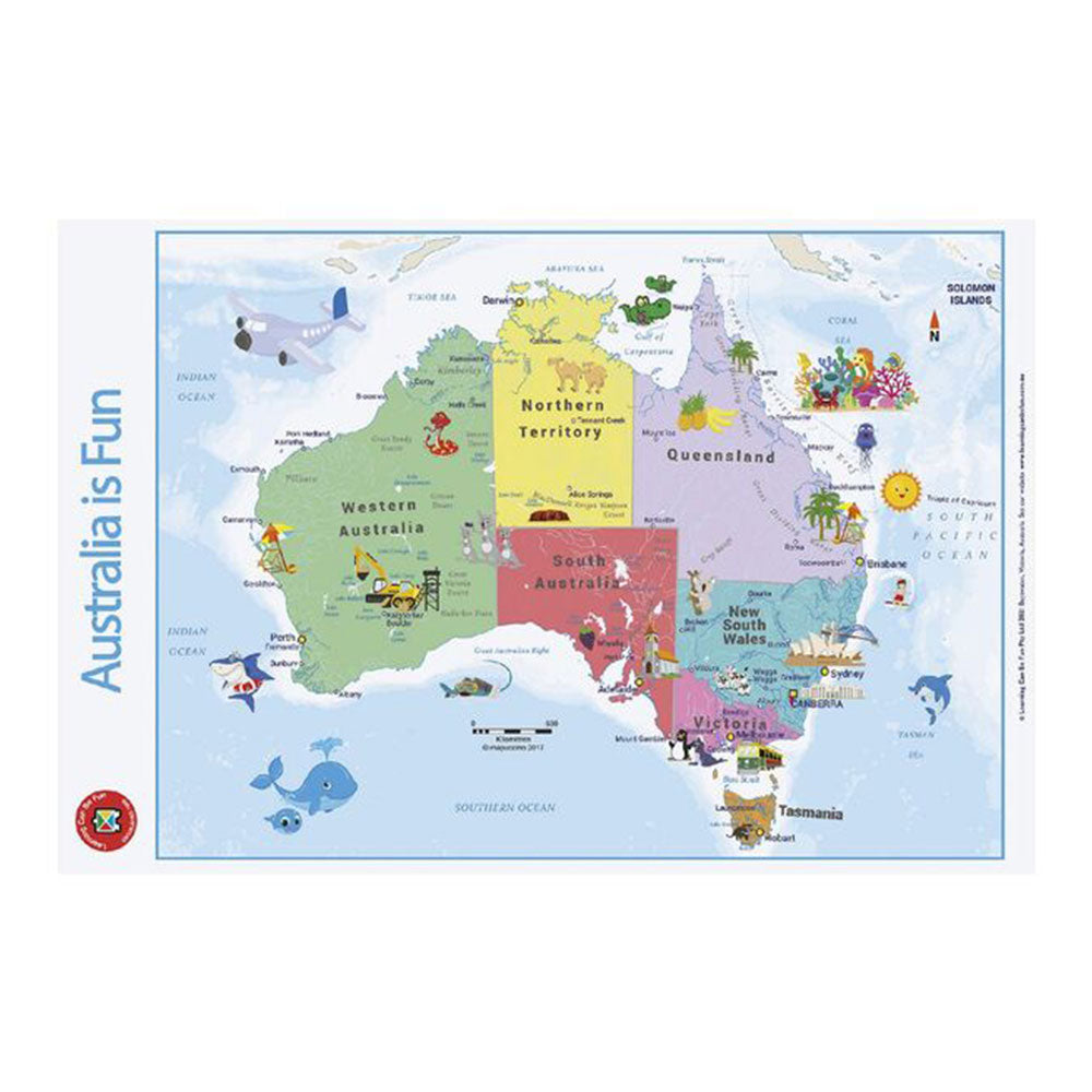 Denne læringen kan være morsomt veggkart er tosidig og har et kart over Australia som er fargerikt og engasjerende for de i alle aldre. Det er høyt i pedagogisk innhold og iøynefallende grafikk, som representerer noen av landets mest ikoniske naturlige og kulturelle attraksjoner og innfødte dyr. Den omvendte siden har et tomt kart som er perfekt for en kunnskapstest med lavt trykk.
