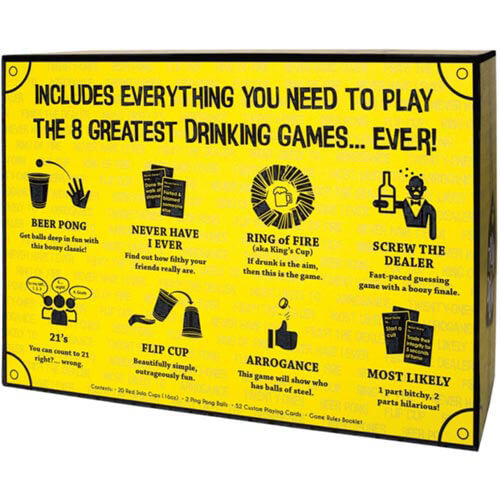 Dostajesz nie tylko 8 klasycznych gier imprezowych w cenie 1, ale także otrzymujesz broszurę reguł, która ocenia każdą grę „wesołością”, „prostoty” i „pijaństwo” i zapewnia proste instrukcje krok po kroku, aby to było Nigdy więcej nie będziesz musiał się kłócić o zasady.
