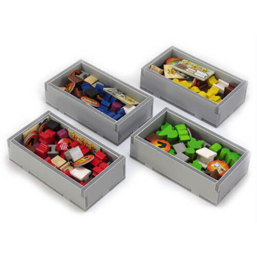 - Die Bretter und Spielerbretter dienen als Deckel auf den Tabletts. Alle Karten können gesleevt werden.