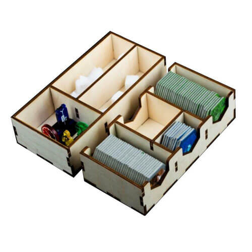 • Zwei separate Ablagen für Hex-Kacheln und andere kleine Würfel/Schiffe