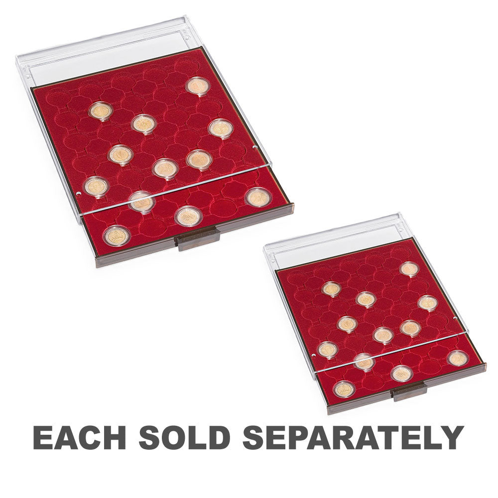 Organize your coins with style using the Leuchtturm 20 round-spaced coin drawer in smoke and red. Featuring spacious compartments for 20 coins, this drawer offers a practical and elegant solution for storing your collection. Whether you collect coins for pleasure or investment, this round-spaced coin drawer provides a secure and stylish storage solution. Let this Leuchtturm coin drawer be your reliable companion as you manage and protect your coin collection, ensuring that each piece is stored safely and displayed with pride.