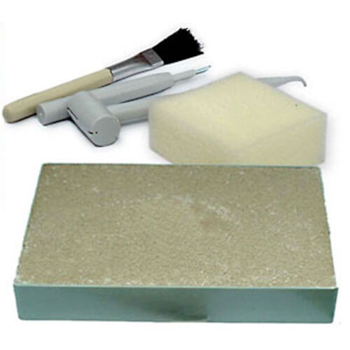 Escavar o esqueleto do bloco e, em seguida, monte para compensar esta réplica de qualidade. O esqueleto é composto por cerca de 8 peças e as ferramentas do paleontologista (martelo e cinzel) estão incluídas na embalagem.