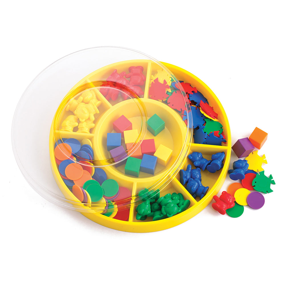 • Set Includes: 132 x Pieces (Basic Shapes, Bears, and Fish), 1 x Circular Sorting Tray with Lid