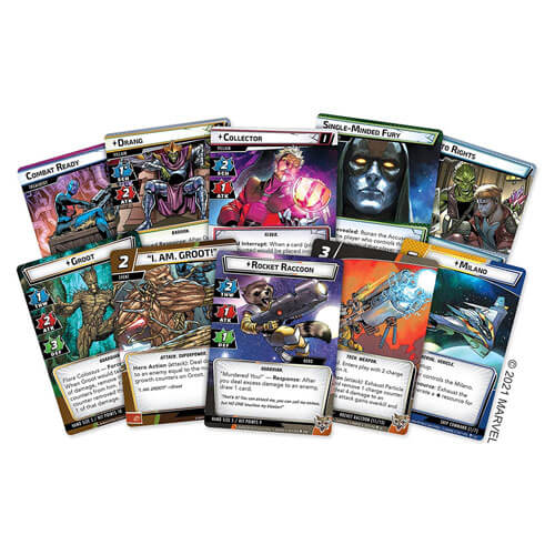 - Osannolika hjältar: Inom Galaxy's Most Wanted hittar du två förbyggda hjältedäck som är redo att lansera dig till att slåss tillsammans med Guardians of the Galaxy: Groot och Rocker Racoon.