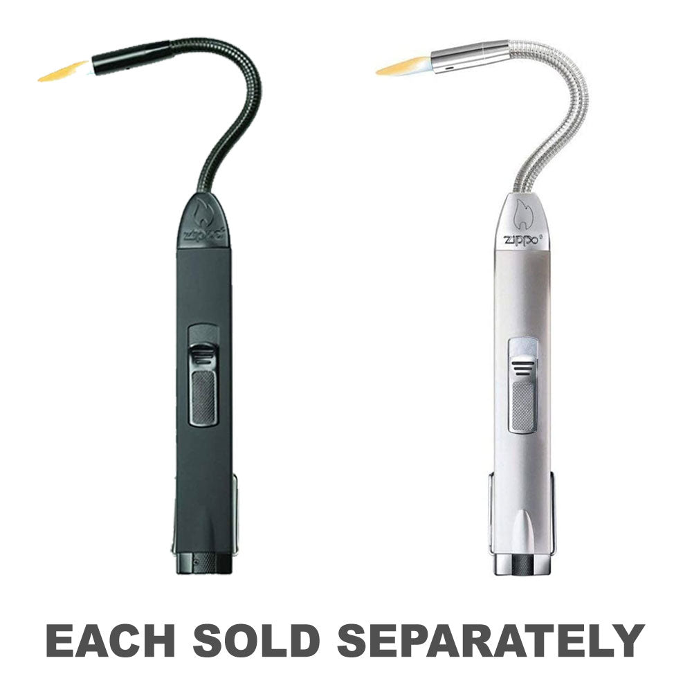 Zippo Flexible Neck Outdoor Utility Tändare är platt svart aluminiumkonstruktion med gummierade skär. Vindbeständig dubbel flamteknik. Flexibel utökad nacke, toppad av ett smalt, kraftfullt munstycke, passar enkelt alla belysningsöppningar. Avancerat tändningssystem. Indikator för bränslenivå. Justerbar flamma patenterad barnresistent säkerhetsknapp. Rostfri hängsling. Perfekt för camping, lyktor, eldstäder, tiki -facklor, grillar, lägereldar och mer. Standardfasformen med rundade hörn och topp med en platt botten. En gångjärn med fem fat går till toppen och botten. Den har en standardinsats med 16 hål i skorstenen (8 per sida). Botten är stämplad med Zippo -logotyp från perioden autentiserar dessa tändare som äkta Zippo.